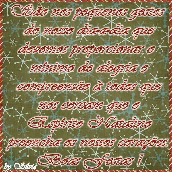 Ééé... estamos à 2 dias do Natal, aqui do outro lado do mundo o dia já se foi... e vou contar uma coisinha... Hoje foi feriado Nacional.... por que é aniversário do Imperador... E acreditem ainda.... quinta-feira, dia 25 Natal... estarei trabalhando... Pois é, aqui não se comemora esse dia sagrado, o Natal é apenas simbólico, onde alguns japoneses comemoram com um bolo enfeitado e tal... por falar em enfeite é tudo muuuito lindo as luzes de Natal, adoro demais... a Yasmin tbm... Maasss... não vou ficar triste não, agora com essa crise mundial tenho que agradecer por estar trabalhando né... E descobri ao longo desses quase 9 anos morando aqui, que o melhor Natal está dentro de nós... que estando com as pessoas que amamos distrubuindo afeto, tendo paz interior é o que conta... E é o que mais desejo pra mim, á minha família, meus amigos... e á vc que está lendo neste momento... Vou deixar alguns trabalhinhos que fiz no meu amigo e terapeuta "PSP"...rs